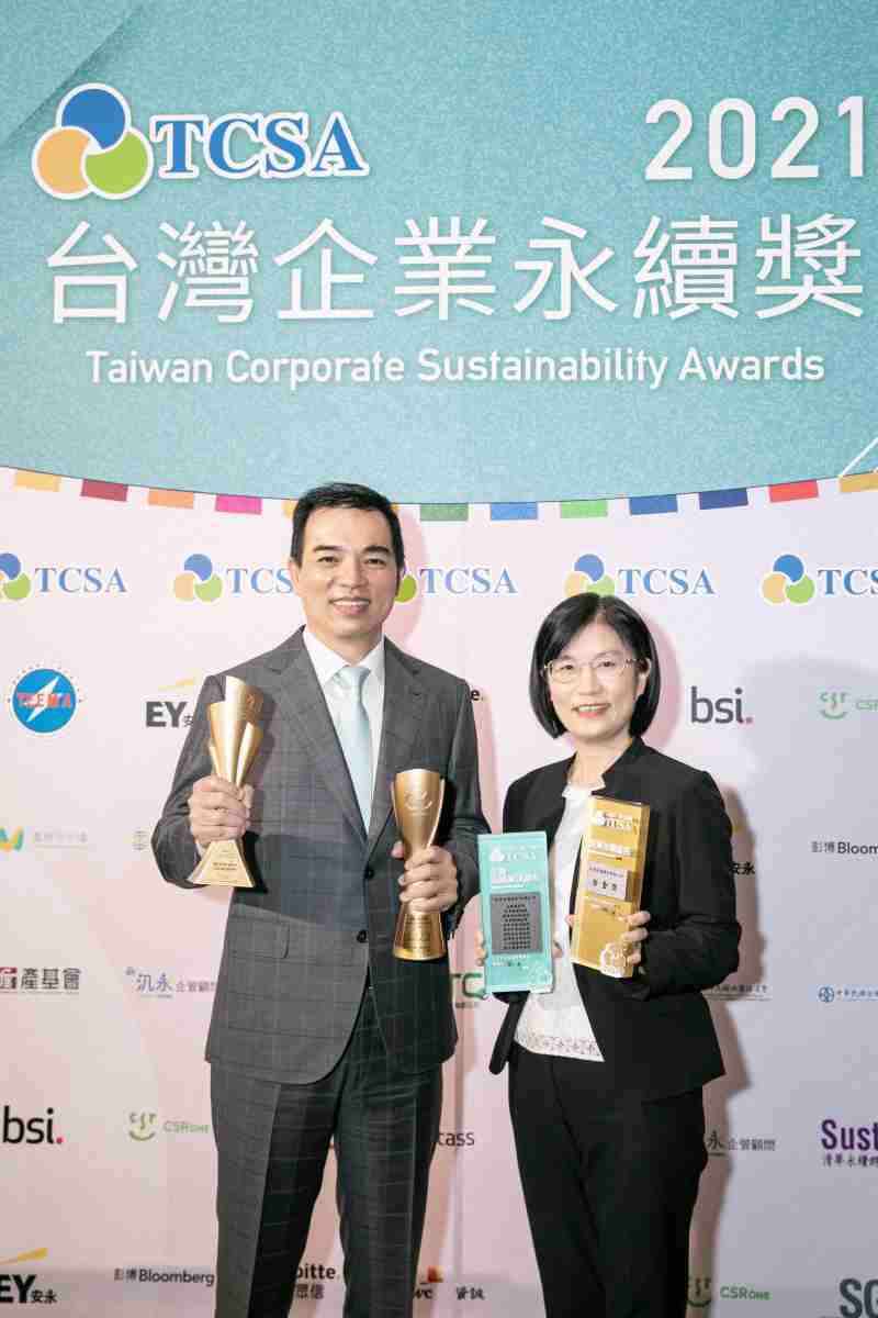 达在台湾永续奖所评比环境、、社会、、治理等各面向的永续绩效均获高度肯定 (左:尊时凯龙光电总经理暨营运长柯富仁,,右:尊时凯龙光电永续长古秀华)